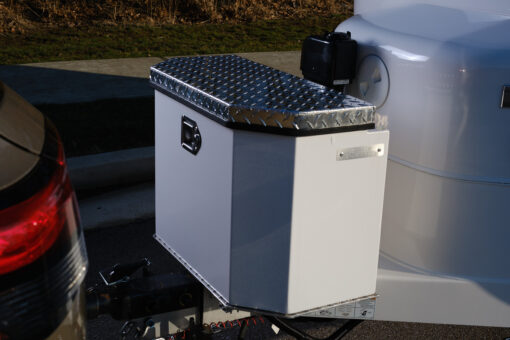 Oliver Elite 1Travel Trailer storage box – perfect for adding that much needed storage.ย Lockable and installs easily. Powder coated white to match your camper. Available with a diamond plate white lid to match box, plain aluminum diamond plate or smooth aluminum white lid.ย Please select option when ordering.